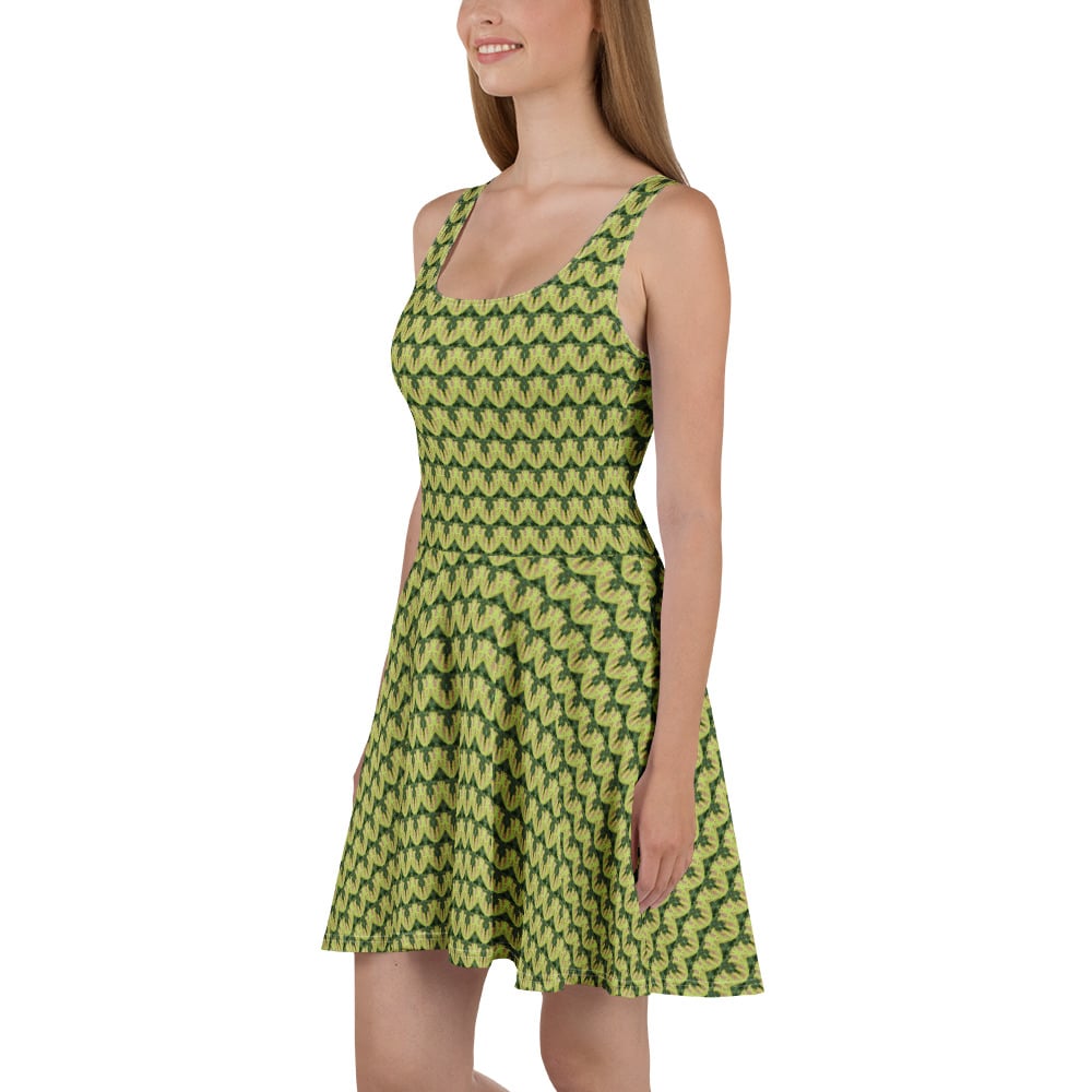 The soft fabric and flared skirt give it an elegant twist that brings out the intricate design of a Monstera Leaf with a beautiful vibrancy.