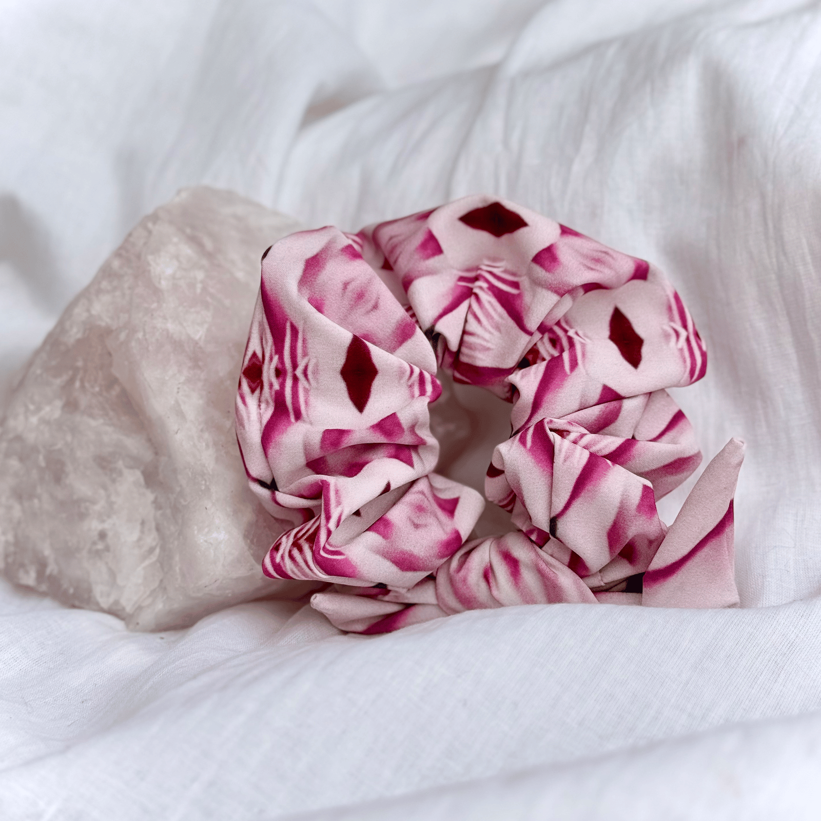 Elegant with a bold twist, this scrunchie is inspired by the serene beauty of the water lily. Its soft pink tones paired with magenta accents create the perfect balance of calm and vibrance—like petals floating on a summer pond at dusk.